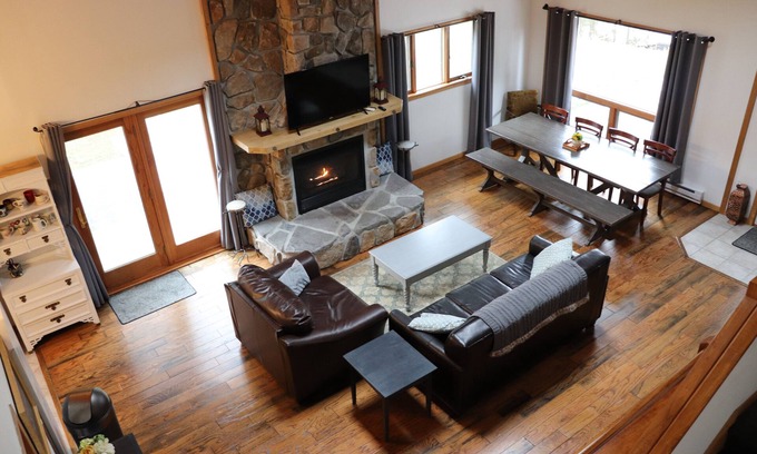 On the upper level you will find 3 bedrooms and 2 bathrooms. A couples retreat with a queen bed, the long hallway room, with 2 queen beds, and a family suite with a king bed and full over full bunk bed featuring newly refinished en suite bathroom.