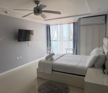 Large Luxurious Beach Front at Bayfront Villa offers accommodations in Portmore, a few steps from Bayside Beach and 1.5 miles from Dream Beach. This beachfront property offers access to free Wifi and free private parking. The apartment provides a pool with scenic views and full-day security. The air-conditioned apartment consists of 1 bedroom, a living room, a fully equipped kitchen with an oven and a kettle, and 2 bathrooms with a shower and free toiletries. Guests can enjoy a meal on an outdoor dining area while overlooking the sea views. For added privacy, the accommodation has a private entrance and soundproofing. For guests with children, the apartment offers a children's playground. A car rental service and a private beach area are provided at Large Luxurious Beach Front at Bayfront Villa.
