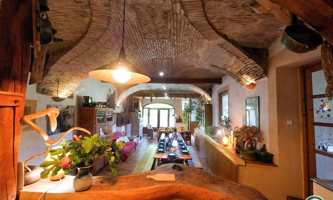 Large vaulted living room measuring 65 m², a remarkable and unique room in the Hautes-Alpes thanks to its original early 18th-century aesthetic “decor” (high brick vault). Electric heating and a monumental 2-ton wood-burning stove made entirely of earthenware and over 150 years old, providing gentle heat.
