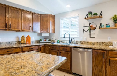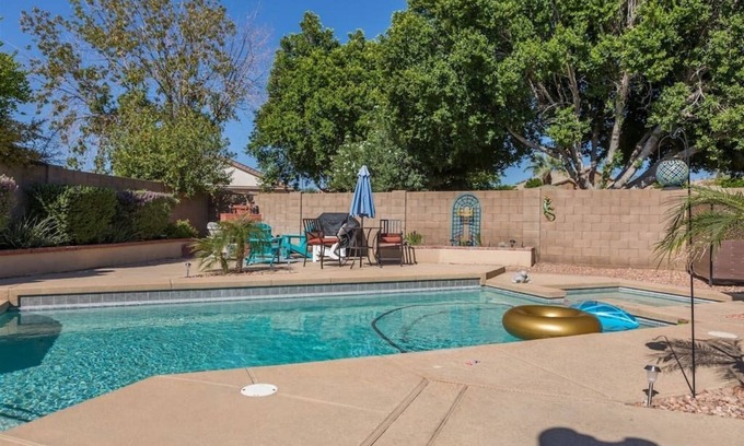 Longer Stay Discounts! Love the relaxing AZ life at this 4 bedroom home located in a Avondale neighborhood near the I-10. It boasts a large backyard swimming pool with connected spa (pool/spa heating optional), a backyard BBQ, multiple patio sitting areas, and a pool table. The home has been recently furnished and upgraded and is perfect for a relaxing weekend getaway, a week vacation, or a month long stay (please ask us for our longer term discounts).