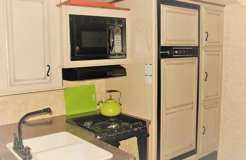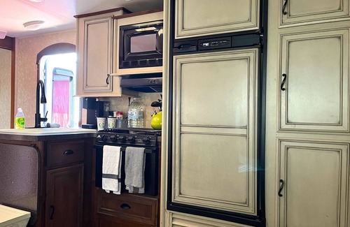 This 35 foot open Range trailer has a front bedroom with a queen and a back bedroom with 2 twins. Full bathroom and full kitchen. There is free WIFI and plenty of coffee pods for the Keurig coffee machine!
