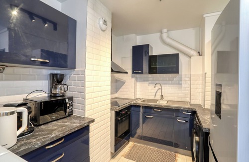 - A fully equipped and functional kitchen with an oven, a ceramic hob, a microwave, a hood, a toaster, a coffee machine, many arrangements, a fridge.