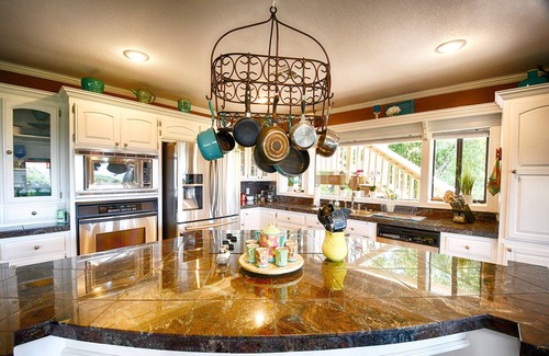 The main house boasts 6 bedrooms and 3.5 baths. The pool cabana has a 7th bedroom, full bath, and full kitchen for meal prep by the pool. The pool features diving board and waterfall.