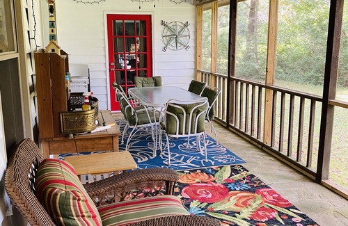 One story mountaintop bungalow sits on two acres and is perfect for a family vacation, girl's retreat or home base when attending a Lodge or Burritt wedding. Those interested in Huntsville's space history will find this house and the story it tells fascinating. With the wonder of nature right outside your back door, you are able to walk or ride a bike to the state park with its beautiful hiking trails and you are still only minutes away from the Medical District, 5 Points and the Space and Rocket Center. If you head west you are only 5 miles from the Robert Trent Jones golf course and Hampton Cove. This fully furnished home has a king bed in the master bedroom with a huge walk in closet (which has a youth bed in it), a queen bed in the second bedroom, and two twins or a king in the library. There are also two foldaway beds, 3 camp cots and a baby bed if needed. The house has two full bathrooms; one with a tub shower, and the other with a walk in shower. There are two steps down (with handicap handrail) from the living room to the bedrooms. There is plenty of closet space, a full sized washer and dryer, iron and ironing board, cookware, dishes and utensils, a dining table that will seat 10, a well stocked library and a gorgeous fireplace to sit and enjoy yourself for as long as you like. TV, high speed wireless internet, outdoor fire pit grill, screened porch, pool table, and many more amenities are provided. This lovely home is filled with beautiful antiques, oriental carpets and all the extras to make you feel right at home. The hosts live next door and can help with any particular needs you might have. No pets allowed, but we have 2 dogs you can borrow if you need a hug!