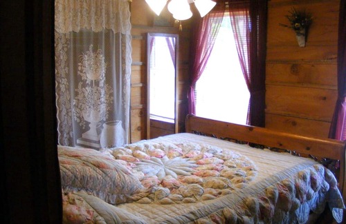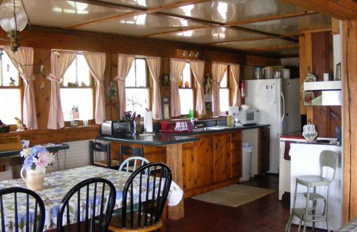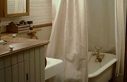 The Rustic Lodge Features 3 bedrooms and can sleep up to seven. Bathroom has a charming claw foot soaking tub with an in-tub shower. The large kitchen, dining, and living room area all have beautiful views of the river. A large deck off the front of the house also provides views of the river falls below. The Spring River is just steps away for great fishing, swimming, canoeing, and kayaking.
