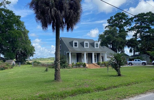 This rustic, spacious home has all you need to have a wonderful time in a simple setting. 5 bedroom (1 walkthrough), 3 and a half bath house just off the Broad River. House sits on an acre lot with beautiful views of Habersham and Broad River. The Broad River bridge boat landing and fishing pier are very close. Private deep-water dock with over 8 feet of water at low tide. Lots of space for families and friends, and tons of great fishing, swimming, and kayaking all around. House sleeps 13 comfortably with brand new Lucid mattresses in every room (3 Kings, 3 Queens, Twin XL, and 2 queen air mattresses). Also, high speed Wi-Fi throughout the house equipped with smart TVs in most rooms. There is a huge yard for activities and a nice screened in porch to relax and watch the sunset and see the flyovers.