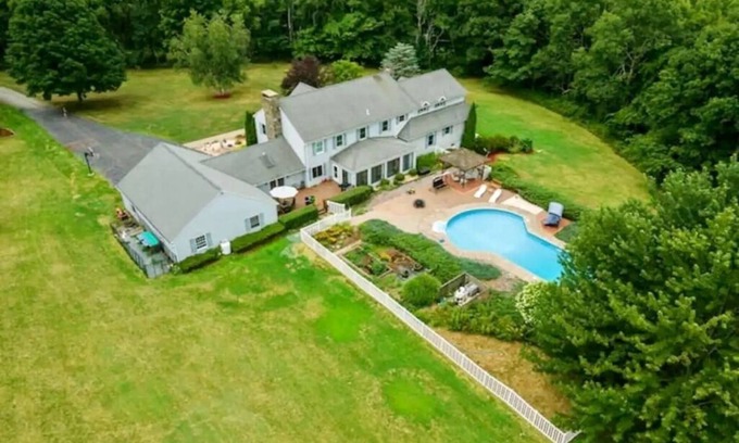 Large secluded home with 44' pool, hot tub, and gym on 32 acres. There are 6 bedrooms, 2.5 bathrooms, and a recreation room with Ping Pong, Mega Chess, Giant Jenga, and Giant Connect 4. Separate entertainment/bar area. Large master bedroom with master bath with whirlpool tub. 5 acres of lawn area, 2 Laundry rooms. Full kitchen. Perfect for family stays. The pool has a large shallow end that is great for kids. It's a nice remote area for watching the stars at night. Very quiet and peaceful!