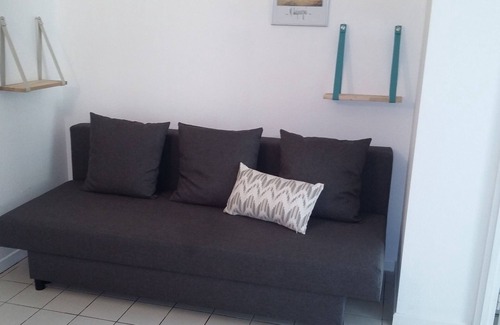 Large studio in a quiet residence with swimming pool and private parking, in the heart of the small village of Guéthary on the Basque coast. 2 adults and 2 children, a large living room with a dining area and sofa bed, an entrance with sofa bed, a bathroom with bath and a large terrace with plant containers, ideal for small children. The hiring is equipped and will allow you to relax in a perfect setting for the holiday.