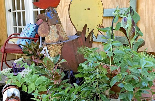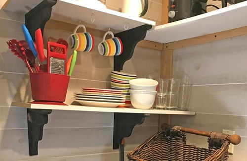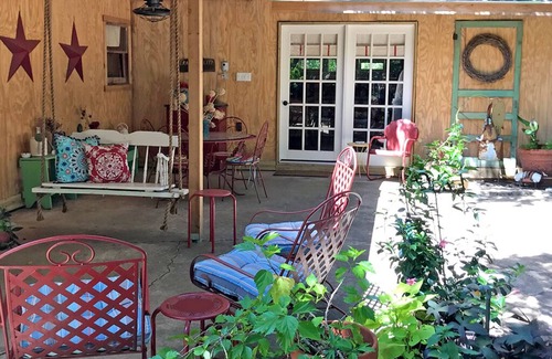 Quiet country setting with private entrance and enclosed bath including extra large soaking tub with shower. Efficiency kitchen has apartment-sized fridge, microwave, coffee and tea pot, electric skillet and crockpot. Large room has cheerful king-size bed, breakfast table and chairs. Outside patio area has a porch swing and ceiling fans, sweet cats, birds galore to wake you through french door entrance.