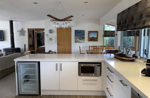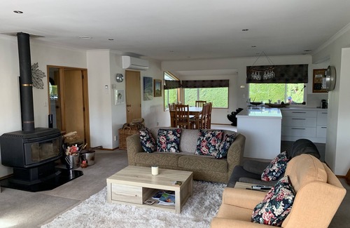 This sunny home has recently been renovated and redecorated with new carpet being layed November 2023. The lounge/living area has large bifold doors opening out on to a sunny deck that is a sun trap. The inside area contains a large log fire with heat transfer unit. All 5 of the bedrooms have queen beds, the fifth has 2 single beds aswell as the queen bed. We encourage our guests to bring their own linen (sheets pillowcases and towels) however if this is not possible we can provide them for $150 this includes the washing. If you are wanting to hire our linen we ask that this additional charge be paid directly to me to cover the linen laundering costs. I can provide those details once you have booked. The master bedroom has an ensuite. There are 3 bathrooms servicing the 5 bedrooms.