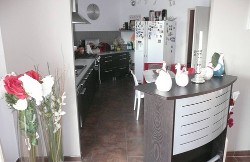 Kitchen: American fridge, piano with large oven, microwave, dishwasher, washing machine in central storeroom