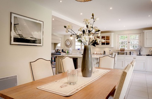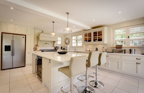 The entrance hallway leads to a new custom made kitchen with stone work surfaces, it is fully equipped and has a large fridge freezer, drinks fridge, wine fridge, double oven and gas cooking range. The kitchen is open plan and leads into a large dining area then into the main lounge area with fireplace, comfortable sofas, large windows lining one wall with patio doors giving access to the ground floor terrace where you can admire the manicured gardens.