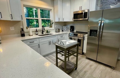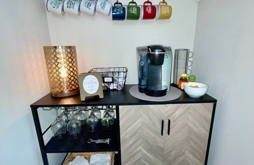 We provide numerous amenities: bed linens, bath towels, kitchen towels, & a fully equipped kitchen with a coffee bar.