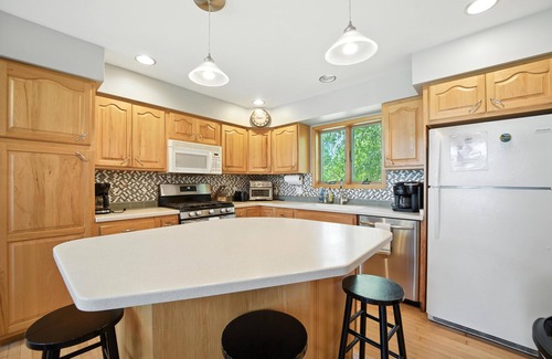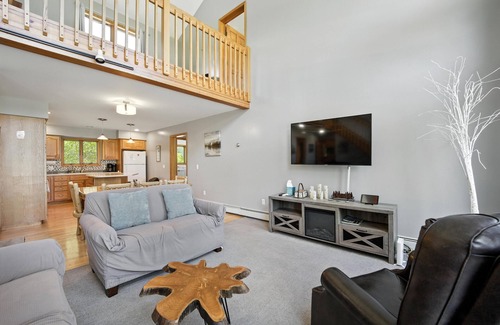 The open floor plan and cathedral ceilings on the ground floor, with a wall of large windows facing the lake, make this vacation home a light, airy and beautiful place to stay. Furnished with Northwoods decor, other attractive features include walk-out balconies facing the lake in the upstairs bedrooms and a loft area that provides extra sleeping capacity. There is a fully-equipped kitchen with an island and a dining table that seats 8 to 10 comfortably. There is a bar off the living room which has a wood-burning stove (as it's sole source of heat for that 1 room) and offers another gathering place to entertain friends and family.