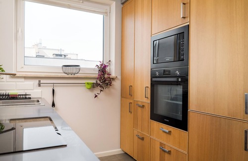 Las Bródnowski Urban Jungle Apartment is a practical and cozy apartment featuring a living room with a sofa bed and kitchenette, a bedroom with a comfortable king-size bed and an additional sofa bed, a bathroom, and two balconies where guests can relax and enjoy their morning coffee or an evening glass of wine. The apartment is equipped with a desk, making it suitable for studying or remote work. Guests have access to a wide range of amenities, including free Wi-Fi, cable TV, an iron, a washing machine, a hairdryer, a dishwasher, a fridge with freezer, an induction hob, an oven, a microwave, a toaster, a Nespresso coffee machine, a kettle, and kitchenware. The apartment also features air conditioning, ensuring great comfort, especially during hot days. Guests also have access to a parking space in the underground garage.
