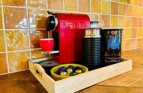 The kitchen has a fridge, a hob, an oven, a toaster, , a coffee maker and a freezer.
