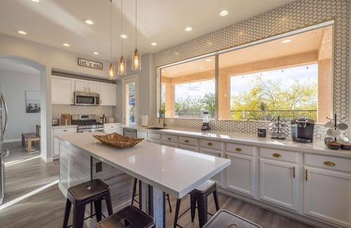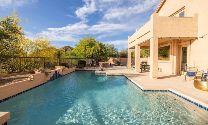 Great for kids and adults, Las Sendas offers an exquisite blend of comfort and elegance, ideal for families. Featuring a second-story balcony and a backyard patio with a pool and spa, a cozy firepit, and captivating desert views, the home provides a serene retreat. Inside, you will find spacious living areas, a fully equipped kitchen, and four comfortable bedrooms, accommodating up to 14 guests.