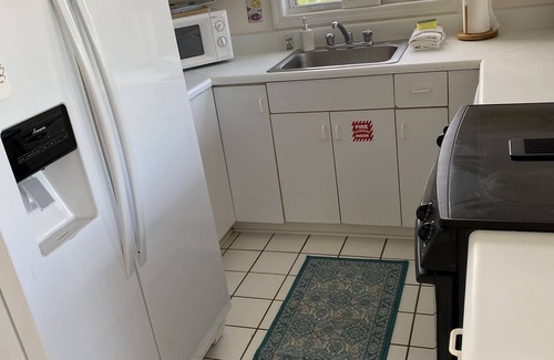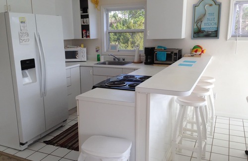 The kitchen with breakfast bar keeps the chefs of the family just earshot away. It is equipped with dishes, microwave, side by side refrigerator, stove, oven, toaster, pans, coffee maker, blender. You will enjoy the view of the Gulf while preparing your meal!
