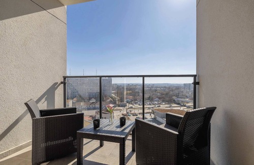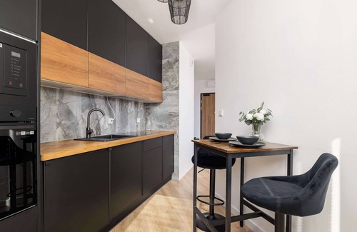 The apartment was designed with comfort, aesthetics and everyday convenience in mind. A spacious living room with a large balcony window brings in plenty of natural light, creating a bright and open space ideal for relaxing after a busy day. There is a comfortable sofa bed, a stylish coffee table and a Smart TV with WiFi access - the perfect set for both an evening movie and relaxing with music or your favorite TV series. From the living room you can access the furnished balcony, which is a pleasant extension of the living area. This is an ideal place for morning coffee or evening relaxation in the fresh air. The living room seamlessly merges with the modern kitchenette, which - although separated by a subtle wall - maintains visual coherence with the living area. The kitchen has been equipped with high-end appliances, including a refrigerator, dishwasher, oven and induction hob, as well as a set of necessary dishes and accessories. As a result, guests can easily prepare meals and enjoy them at the elegant dining table. In the separate bedroom, a large, comfortable double bed with a set of linens, a functional closet and subtle wooden finishes and wall accents await Guests. The combination of fabrics, colors and textures gives the interior a cozy yet modern character, conducive to regeneration. The stylish bathroom, decorated in elegant dark tones, has been equipped with a bathtub with a shower function, a bathroom sink with a large mirror, a washing machine and a set of toiletries. It's a perfect place for evening relaxation or a quick refreshment during the day. The whole is complemented by thoughtful finishing details and a functional layout of the rooms, which together create a comfortable interior for a short or longer stay.