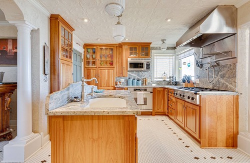 Pass through the oceanfront living room to a large, formal dining room that accommodates 8 guests, allowing your whole group to dine together at one table. The vast, custom kitchen is right off the dining room and features a large island, french door fridge/freezer, and is stocked with all the cooking necessities. The home also includes a full-size laundry room for convenience located near the kitchen. Through the kitchen sits a uniquely medieval themed bar and family room. A half bathroom is located by the stairs on the first floor.