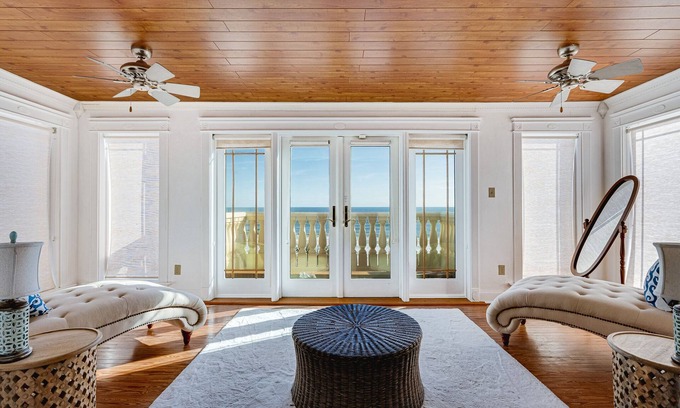 Set directly on the ocean, this historic, spacious home offers privacy and luxury for your next gathering of family and friends. Originally built over 100 years ago in roaring 20s, this retreat affords the perfect balance of history and modern luxuries. You'll feel the weight of the world lift off your shoulders as you enter this luxurious oceanfront paradise. The open floor plans allows the Atlantic Ocean to greet you from the moment you walk into the home with floor to ceiling grand windows strung along the back of the home. To the right of the entrance you'll pass through glass French doors to a lovely oceanfront office space that has been converted into an additional bedroom. The twin bed in this room uniquely and conveniently transforms into a king bed.