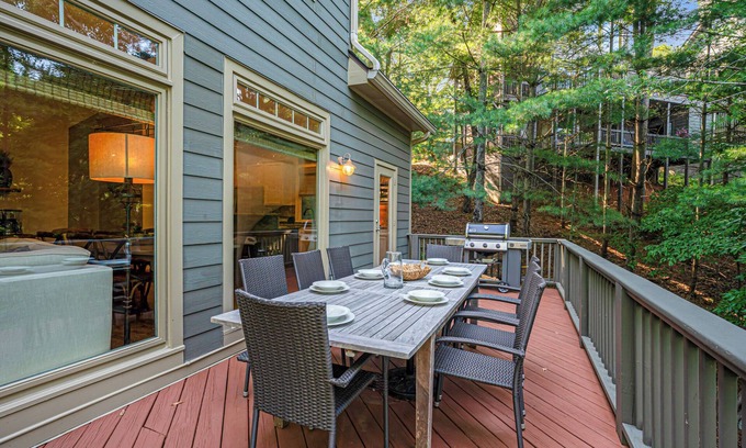 Situated on a private lot with relaxing views, the home offers five updated bedrooms and 4.5 baths, accommodating up to 10 guests. The state-of-the-art kitchen with granite countertops and new stainless steel appliances opens to a luxurious den with a stacked stone wood-burning fireplace and a 48" flat screen TV. The main level includes a dining area for 12, a king master suite with a jetted tub and step shower, a cozy screened porch, and a large deck with outdoor dining options.