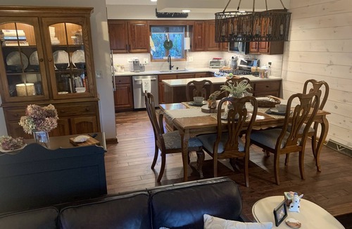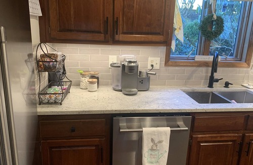 Well-stocked Kitchen has gas stove/oven, dishwasher, microwave and refrigerator/freezer. Keurig coffee maker and variety of coffee and hot chocolate K-Cups. Eggs, Milk, Juices, Cereal, Breakfast Items, Snacks, waters and sodas provided upon arrival of your stay.