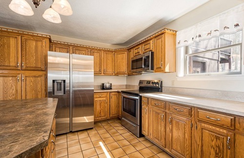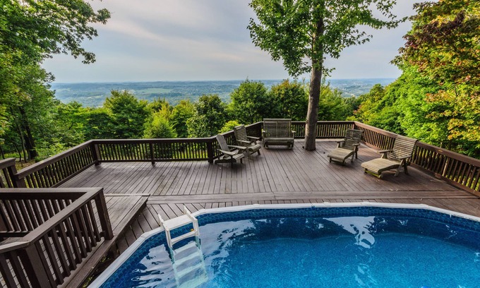 The Laurel View boasts one of the most incredible views in Fayette County. The home is situated at over 2000 feet above Uniontown on the Summit Mountain. The Laurel View offers eight bedrooms with four baths. Some of the amenities include: two wide screen flat televisions with satellite, an air hockey table and pool table. This property is dog friendly.* Additional flat fee will be charged per pet, if necessary, after receiving your signed Rental Agreement. This unit also includes High Speed Internet with WIFI throughout the house. Head outdoors to bask in the sun or just sit back and relax in the covered outdoor hot tub. Both offer the panoramic view of the city that make this home a true must see!! Mother Nature created this picturesque view which is truly a work of art. Enjoy a serene view of the new morning fog hanging over the low lands below or the spectacular view of the Laurel Ridge as you have never seen it before. In the evening the city's lights come alive and perform a spectacular show! Laurel View is decorated in natural oak and cedar which accentuates the openness of the cathedral ceiling and third floor balcony. For the ultimate entertainer, the large multi-level deck provides a nice setting for any outdoor occasion. (Pool open Memorial Day-Labor Day only) Imagine yourself unwinding from your cares in the large great room overlooking the spectacular panoramic view of Southwestern Pennsylvania. The aesthetic view and surrounding with its mountain laurels, maples and oaks along with a frequent glimpse of the Pennsylvania's wildlife must be seen to truly appreciate. *Please note that room layout is spread over multi-levels requiring stairs to access. High Speed Internet and Satellite TV!