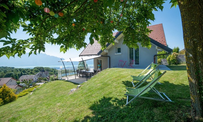 Quiet villa on a plot of 1400 m2 with a panoramic view of the largest natural lake in France. Large terrace with outdoor lounge and barbecue.