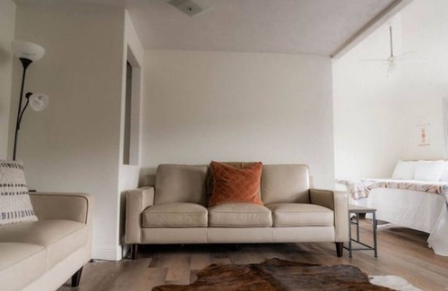 2 levels featuring a kitchen, living room, bathroom, and laundry on the main floor. Head upstairs to the open loft with 4 queen beds, a lounging area with TV, books, and games. Upstairs also features two more bedrooms including our master suite with a king bed, TV, and bathroom featuring a freestanding tub and gorgeous sunset views. The King suite also has a separate entrance to the rooftop patio that will be ready this Spring. A second bathroom and shower is located off the loft.