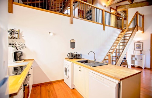 Access to the gite is via stairs to the large terrace that overlooks the walled gardens. The terrace is set up for outdoor dining & has a Weber gas BBQ. The spacious lounge, dining and kitchen area has wooden floors & high vaulted ceiling with exposed beams. There is a large sofa, seating area, an indoor dining area and a fully equipped kitchen.