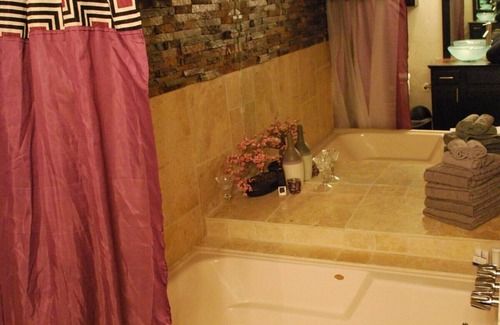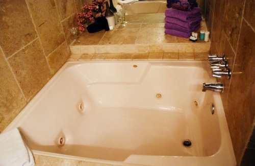 The Lavender & Lace Suite, modern and chic, sends an array of subtle peace to the mind. Lavender, known to calm the spirits and soothe the soul, does exactly just that. Clear your mind with a dip in its more than spacious double Jacuzzi and you will be asking yourself..."Why ask for more?"... This room features a king-size low platform bed, a mini-fridge and microwave, dining area and a full slate and stone bathroom with shower. This suite is located up the stairs on the second floor. Pet friendly. $35 per pet fee plus $50 refundable deposit.