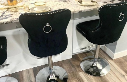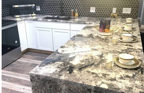 The Lavish Lion unit is extra special with tons of modern safari touches, patagonia granite countertops, tile backsplash, upholstered stools with nail head trim and gold accents.