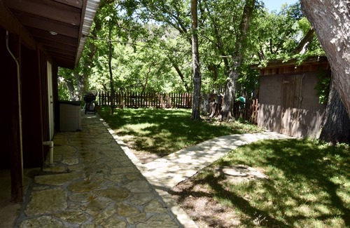 Lazy Achers was built as an 'escape' from the 'aches' & pains of everyday life! "A place to rest your aching body." Come to the Texas Hill Country to relax and enjoy time on the South Fork of the Guadalupe River! This is the perfect place to do just that. You will love the large living room with floor to ceiling windows with a perfect view of the Guadalupe River. When it is cool you can enjoy the rock fireplace that is a great place to curl up and be comfy.