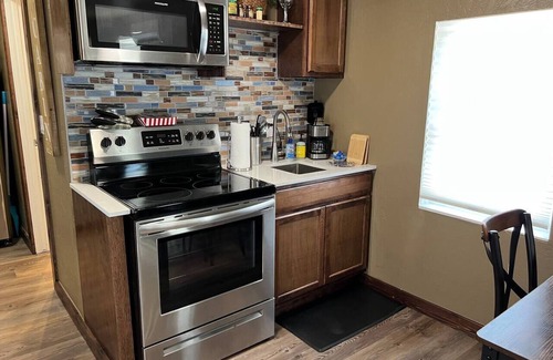 Lazy Bear Cobblestone is located in the heart of Medicine Park. You can walk to the strip in just a couple minutes. When you pull up you will have parking in front of the cabin and notice the large shade trees, patio, and original cobblestone exterior that has been completely refurbished. Passing through the front door you will see your queen bed to the left, seating area with 55” smart tv next, and then on to the dining and kitchen area. The bathroom is located in the back of the cabin along with closet for your clothes. The tv can swivel for viewing in bed. The decor is a mix of bears and fish with one lonely rooster keeping an eye on the place ;-). The kitchen has a stove/oven/microwave combo with sink surrounded by quartz counters. The patio has seating for 5 and a Pit Boss Pellet grill for making your favorite foods. Cornhole boards provided for some fun times. This place is sure to help you relax and unwind on your trip to Medicine Park.