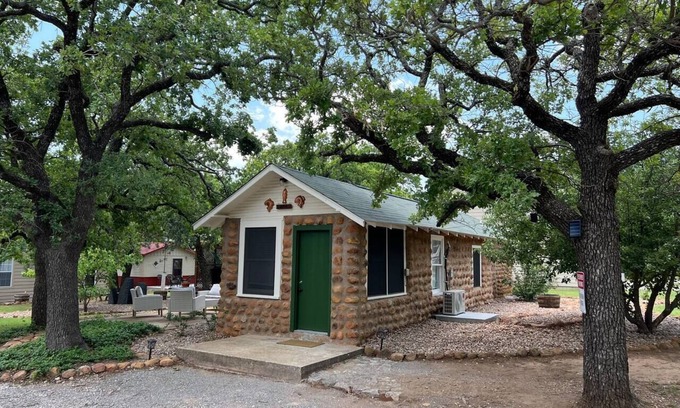 Welcome to the Lazy Bear Cobblestone in Medicine Park! Built in 1908 this cobblestone cabin has been completely remodeled inside while retaining the original look and style of the exterior. This cabin has a kitchen stocked with everything you will need to prepare small meals, fridge with ice maker, full bathroom with closet, dining area, seating area with a smart 55” tv, and queen bed. Outside is a shaded patio with seating and a charcoal grill. Cornhole boards provided in the yard, Stay and Relax! An additional twin air mattresses can be set up for a third person for additional fee.