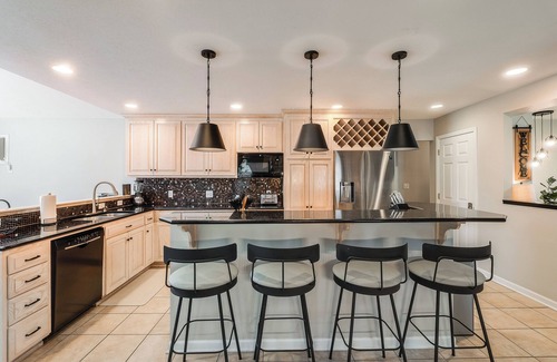 Inside, you’ll be welcomed by beautifully designed bedrooms with plush bedding, ensuring restful nights for everyone. The theater room invites you to settle into reclining seats for movie nights, while the game room offers endless entertainment with a pool table and arcade games. The open-concept living and dining areas are perfect for gathering, with large windows that let in the breathtaking mountain views. And when it’s time to cook, the fully equipped kitchen with stainless steel appliances gives you plenty of space to prepare meals for your group.