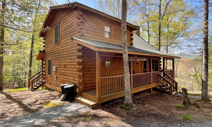 Peace & Quiet among trees and nature! This adorable 2-bedroom log cabin is tucked away in the Brasstown area - just a few minutes from John C Campbell Folk School. Be greeted with a spacious great room offering wood burning fireplace, flat screen TV, comfortable seating, dining table, fully stocked kitchen with bar seating. Lots of windows allow for gazing outside and the wrap around deck on three sides. Main floor offers the guest bedroom with two twin beds and a full bathroom just across the hall. Upstairs is the spacious master bedroom loft with Queen bed and full bathroom. Internet available too. Sit around the firepit for a great way to end the evening roasting marshmallows and enjoying the company of friends or family.