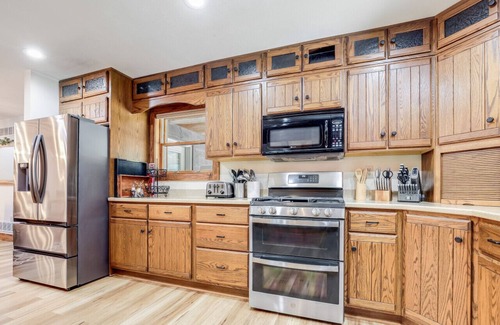 ✅ Extensive cookware, including a Ninja blender, Kitchen Aid hand mixer, immersion hand blender, waffle maker, crockpot, 2 sets of 12 ceramic dinnerware, ceramic and decorative plastic serving trays, various mixing bowls (stainless steel & plastic), multiple strainers, potato ricer, German/Hungarian egg noodle dumpling maker, cutting boards, various utensils, can openers, wine bottle openers, cheese grater, garlic presses, 2 knife block sets with steak knives (1 with sharpener), baking sheets and trays, grilling utensils with a heavy-duty mitten, and a small cowboy cauldron for outdoor cooking