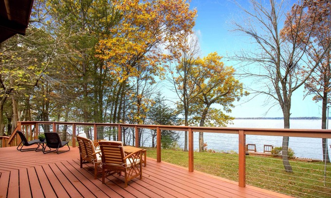 OUTDOOR LIVING: Oversized wraparound deck, gas grill (propane provided), fire pit, open yard, 100-ft lakefront, pier (available Memorial Day-Labor Day), bicycles, kayak, canoe