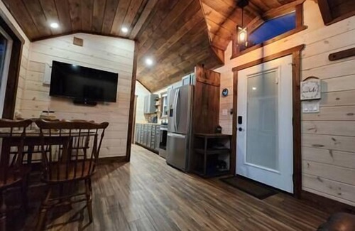 This tiny cabin has been designed for comfort. Take delight in our cozy living room with reclining sofa, while watching your choice of streaming options on our Smart TV or simply enjoying the views outside. Our fully stocked kitchen and table for 4 allows for family meals in. The master bedroom offers a queen sized bed with lots of storage in the built-in wardrobe closets and drawers. The second bedroom features a custom built bunk bed, with a twin sized bed on top and full sized bed on the bottom.