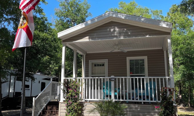 Lazy Oak Cottage is located in the beautiful Sun Retreats Crystal River. We are located five miles from the Gulf of Mexico where you can drop your boat, kayak or paddle board for a day out on the water. From mid October to late March you can swim with the manatees. If it's a summer trip you had in mind, you are right in time for scalloping season, which runs from July1st through late September. The city is home to many wonderful restaurants, several that can also be reached by boat. If shopping is your pleasure Heritage Village, downtown Crystal River has many unique shops. The area also has several antique shops, flea markets, festivals, art shows, rodeos and concert series throughout the year. Recently Citrus County has grown in retail shopping with several chain stores and restaurants opening in Lecanto which is just a quick 4 miles from the Campground. Stores included in the expansion are Hobby Lobby, Target, Petsmart, Sketchers and Aldi’s. Texas Roadhouse, Glory Days Grill, Panda Express, Starbucks and Panera Bread are some of our new restaurants, just to name a few. Lazy Oak Cottage is privately owned by my husband Steve and I and are in no way affiliated with Sun Retreats. We own the cottage but rent the lot, therefore we must ask our guests to stop in the Welcome Center to let the office know that you have arrived and receive a copy of the park rules. We pay the resort fees so that all our guests can use the amenities. The cottage has it’s own free high speed internet. The community pool and hot tub are next to the Welcome Center. The club house adjoins the pool area and has rest rooms, a pool table and a foozeball table. There is also a dog park with two fenced in areas, a shuffle board court, playground and horse shoe pits. My husband Steve and I live across the street in our 5th wheel. We will be around if you should need anything or have any questions. The cottage has many flowers and plants that do need to be watered regularly along with the grass that needs to be mowed but other than that we will in no way bother you during your stay. The cottage has local pamphlets along with our Facebook (Lazy Oak Cottage) page that will give you ideas of what to do and where to go during your stay. The cottage although small has all the comforts of home. The kitchen has all stainless appliances, including a microwave, dishwasher, air fryer, blender and electric hand mixer. We have all the necessary pots and pans to cook any meal you can think of along with the necessary utensils, pizza pan, casserole dish, bread pans and pie plates. For spices we supply the most basic: salt, pepper, onion salt, garlic salt and hot sauce. Anything you need that we do not supply, just ask and most likely we have it in our home to accommodate you. The living area has FlexStone recliner rocker and FlexStone couch with recliners on each end. The 55” Samsung smart TV is mounted on the wall with a full motion swivel above the electric fireplace. The cottage has central heat and A/C but for chilly mornings the fireplace is great if you don’t need the heat but just want to take the chill out of the air. There is also a ceiling fan in the living area with multi speeds. The round dining table seats four and is a drop leaf, saving space when not being used. The bedroom has a queen bed with a medium support Serta mattress with a 100% cotton quilted mattress pad to keep you cool and comfortable. All linens, extra pillows and extra blankets are supplied. The wall above the bed has cabinets as well as storage inside the two nightstands. Above the 8 drawer bureau is a 46” Samsung Smart TV mounted on a move out arm. The closet has a top wire shelf, hangers for your clothes, wooden shoe rack and additional drawers below the closet. The bedroom also has a ceiling fan with multi speeds. The bathroom does not have a medicine cabinet so we have hung shelves for your toiletries and there is some storage under the bathroom sink. The compact stackable washer and dryer are in the bathroom. We supply kitchen and bath towels but you will have to wash your towels as you use them as we do not have laundry service. We will supply you with a package of toilet paper but after that you will need to supply your own. The same for paper towels, we will start you with a new roll. We will also have some laundry detergent, hand soap and dishwasher pods for your convenience to get you going. There will be cleaning products and sponges available should you be in need during your stay, that has always been one of my issues when we rent. Outside the picnic table has been placed centrally from the back door in hopes of making outdoor mealtime more convenient. There is a commercial charcoal grill next to the picnic table should you decide to cook your meals outside. The backyard has a gazebo on patio pavers with chairs and a propane fire pit should you want to relax out by the gardens. There is a single and double wooden swing out there also giving you options as to where you want to enjoy the outdoors at Lazy Oak Cottage!