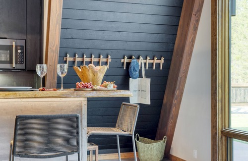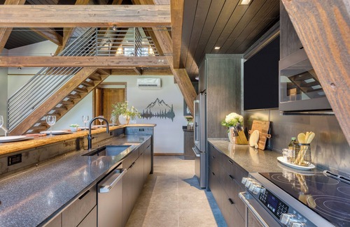 At the center of the home lies an A-frame space with the kitchen. Boasting high-end stainless steel appliances and a sprawling island with barstool seating for eight, it’s a state-of-the-art chef's dream. The living area is designed for relaxation and socializing, featuring a cozy fireplace, plush seating, and stylish décor that exudes both comfort and elegance. Each of the three bedrooms offers a tranquil retreat for a restful night's sleep, while four full bathrooms ensure plenty of privacy.