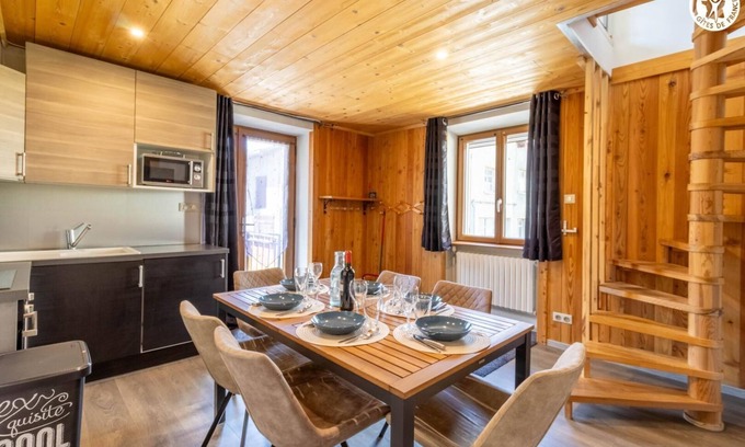 Apartment on two levels accessible by a staircase of approximately 5 steps. Raised ground floor: kitchen, bedroom (1 double bed 160x200 cm), bathroom with WC (shower). 1st floor: living room (1 sofa bed 140x190 cm), 1 bedroom (1 double bed 140x190 cm) opening onto a balcony. Parking space in front of the cottage. Renovated two-story apartment located in the heart of Termignon. Functional and well-appointed, it offers all the essential amenities for a comfortable stay. The south-facing balcony offers unobstructed views.