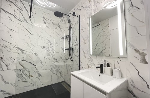The spacious hallway leads to two shower rooms with marble splashbacks, adding a touch of sophistication. Four bright, carefully decorated bedrooms, each with a double bed, storage space and a desk, promise a refined rest.