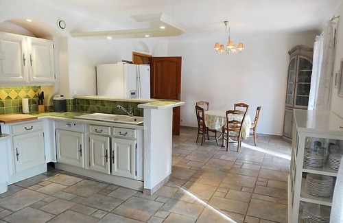 5-room house 255 m2 on 2 levels. Comfortable furnishings: living/dining room 50 m2 with digital TV and DVD. Exit to the terrace. 1 room with 1 french bed, bidet, shower/WC and double hand-basin. Exit to the terrace. 1 room with 1 french bed and shower/WC. Kitchen 35 m2 (oven, dishwasher, 5 induction hot plates, microwave, freezer). Sep. WC. Upper floor: 1 room with 1 french bed. 1 room with 2 beds (90 cm). Bathroom, bidet, sep. WC, double hand-basin. Floor heating. Large terrace 55 m2 partly roofed. Terrace furniture, deck chairs (12). Facilities: washing machine, dryer, children's high chair, baby cot. Internet (WiFi, free). Please note: non-smoking house. "Le Petit Mas" house 55m², 3 rooms, nice layout: dining room 30m², exit to the terrace. 2 bedrooms, each bedroom with a large bed. Kitchenette with 4 hotplates, oven, dishwasher, microwave oven. Bath/WC. Please note: the houses are separated (10m) and independent.