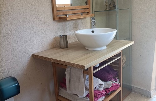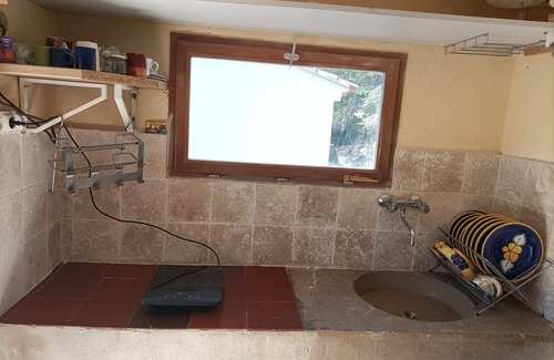 Une petite cuisine fermée fonctionnelle avec une véritable pile provençale carrelée en travertin, mini-lave vaisselle, 2 plaques chauffantes à induction et fours multi fonctions, avec en enfilade la salle d'eau avec lavabo WC et machine à laver. Enfin de l'autre coté, l'extention, attenante avec un lit en 160 d'époque (chauffage d'appoint si nécessaire) avec une "vieille" baie vitrée coulissante donnant sur la terrasse .