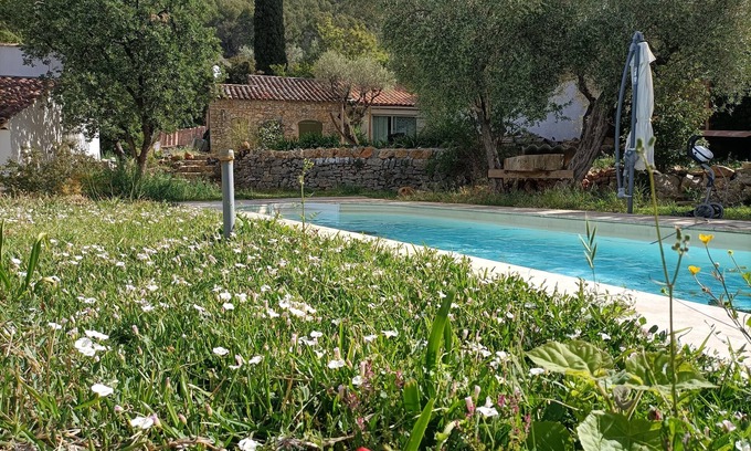 Nous vous proposons un cabanon d'oléiculteur, authentique, rustique/spartiate peut être pour certains, mais il est aménagé à notre goût pour vivre au maximum sur la terrasse ombragée et ensoleillée dans un espace arboré de Chênes, d'oliviers, de jeunes figuiers de lavandes et d'agapanthes. Grande piscine de 11 m, profondeur 110cm, sécurisée par une alarme en immersion, pas de plongeons, de "bombes" ou de course autour svp. Au bord du bassin chaises longues et bains de soleil, parasols, banquettes bois, coussins, nombreux fauteuils relax… Coin détente hamac. Portail automatisé et interphone avec filtre avec téléphone portable.