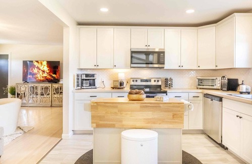 Prepare your meals in a fully-equipped kitchen, complete with sleek stainless steel appliances, charming butcher-block countertops, and all the essentials for your daily dose of caffeine. Dine together with loved ones at the elegant dining table, or relish a memorable barbecue feast on the tranquil back porch.