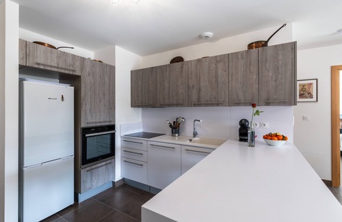 - Kitchen open to the living room and fully equipped: dishwasher, oven, hob, fridge, microwave, Dolce Gusto coffee machine, kettle, toaster, crockery and cutlery, dining area above...